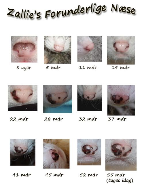 Rigtig godt lavet. Det var netop Zallie jeg tænkte på da jeg skrev om en ilder hvor det sorte på næsen flyttede sig rundt igennem livet. Det er helt utroligt de kan det. Kender ikke noget andet kæledyr er kan skifte farve på så mange måder, og så på næsen GG
