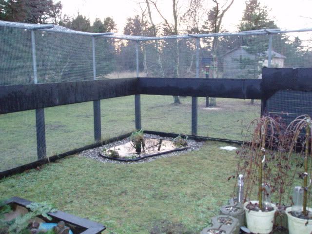 Vi boede i et træsommerhus fra 2000 til 2008. Vi byggede omkring vores terrasse. Eternitplader graves imellem 40 og 60 cm ned, grunden skrånede lidt. Stolper graves i jorden og der monteres voilierenet. Endnu en eternit plade i toppen, for at de ikke kunne kravle over. På halvdelen af indhegningen, satte vi på ydersiden lamelhegn, ud mod vejen.