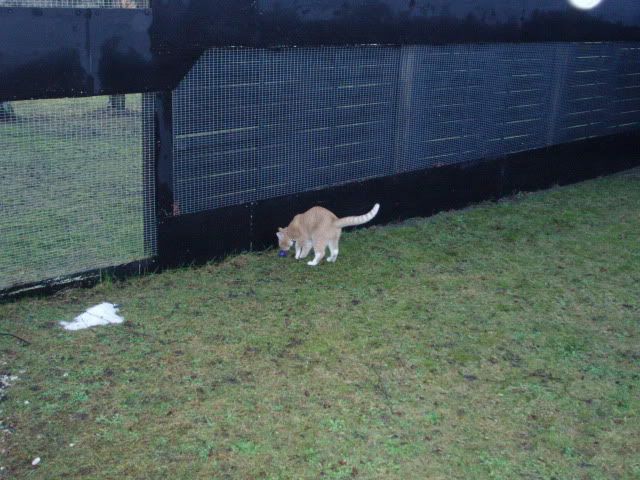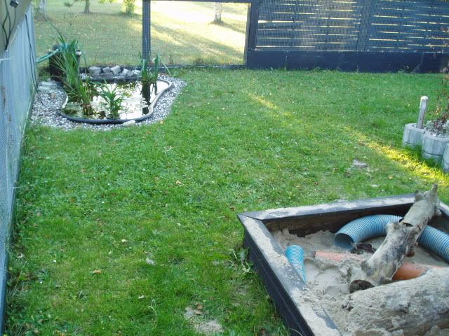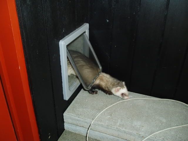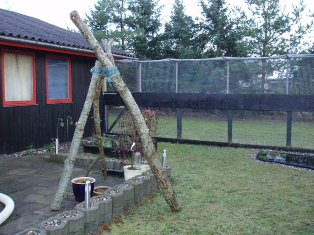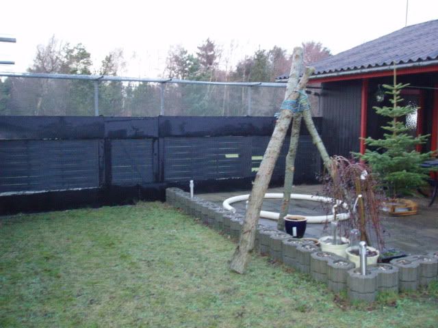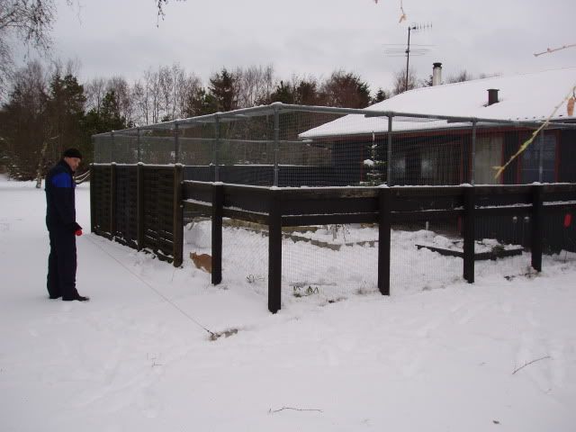 Tak tak...ja de har kun det hus at sove i og så deres transportkasse som de bliver båret derud i, men de bor der heller ikke. De er kun ude og lege der og kommer ind når de bliver trætte her når det er koldt. Om sommeren får de lov til at sove lidt mere derude. Hvis de skulle bo der, skulle der laves et større hus, som også var isoleret, eller de skulle have adgang til et isoleret areal i garagen (garagen er inde bag den ene mur nemlig). Det jeg har er ikke godt nok, hvis ildere skal bo derude.