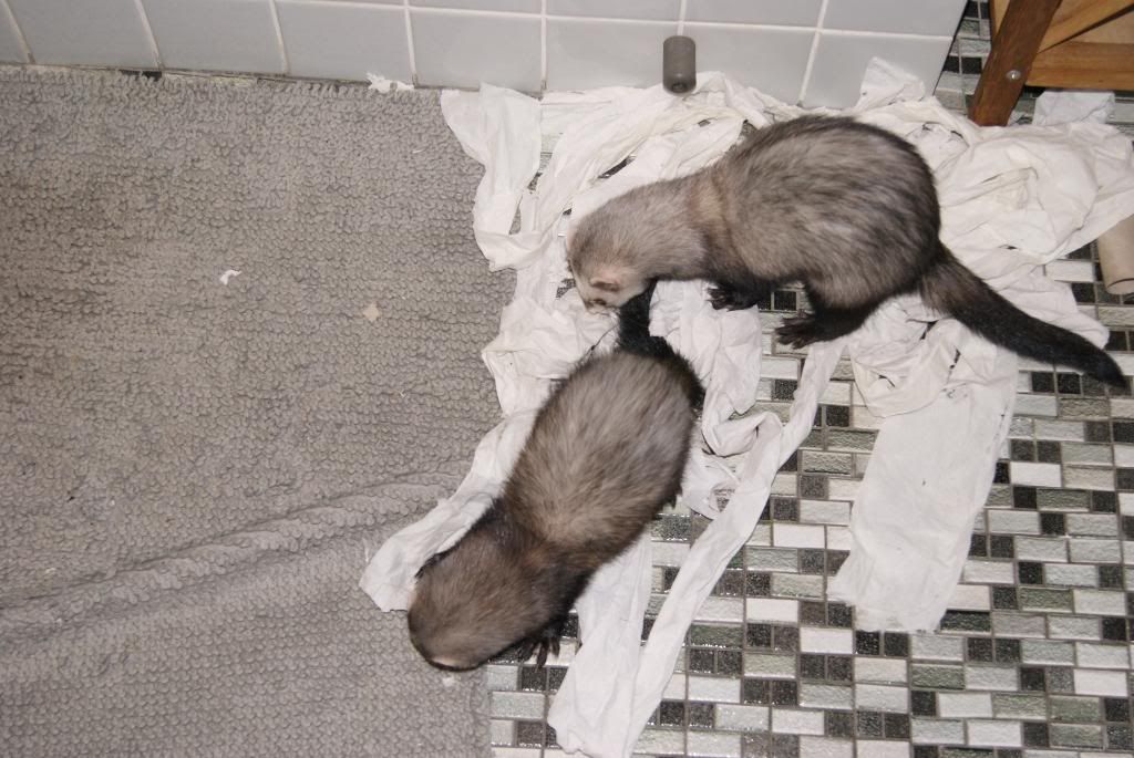 Toiletpapiret er simpelthen deres bedste legetøj. På billedet kan man lige ane en reol og hver dag løber de ud og tager alt toiletpapir og tomme ruller ud fra reolen (de er gemt nederst) og når det hele er ude skal det hele ind igen og sådan kan det fortsætte i flere timer. Selv det mindste stykke papir bliver ordnet. Den anden dag havde de dog ryddet alt om fra gulvet incl. Min søns trusser, mine tærningsbukser, et håndklæde og bademåtten. Det var lige før de ikke kunne komme ud igen.
