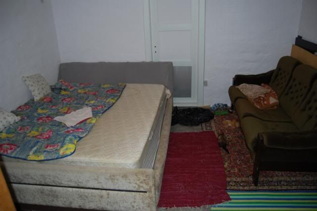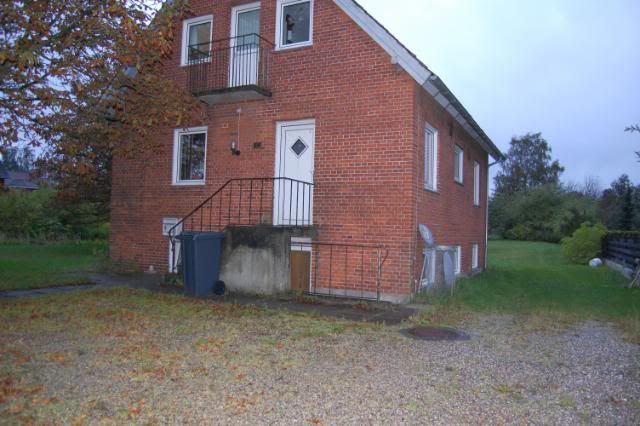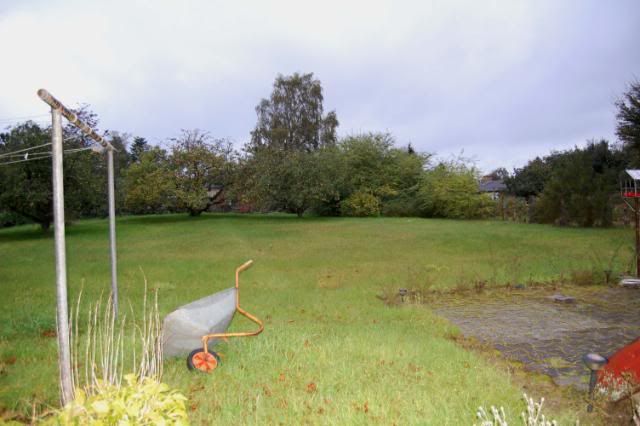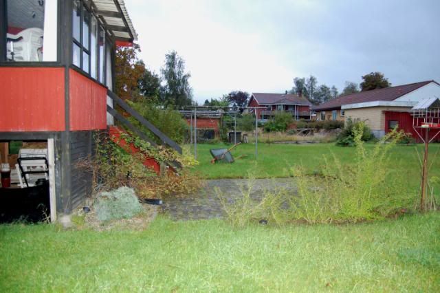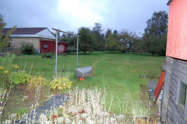 Lidt af min udestue og den røde bygning man kan se er naboen garage...foran den kan man se noget mørkt...det er min snart opslidte ude halløj til dyrene