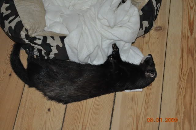 Trines dyr er sgu dejlige - lidt sære ind imellem, men dejlige!!  ;) De sover virkelig de særeste steder de kræ...men ved siden af en seng er da fremskridt i forhold til bakken!  :P
