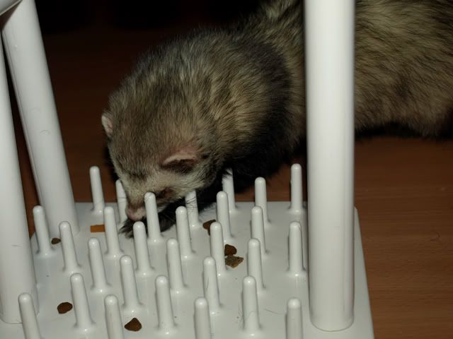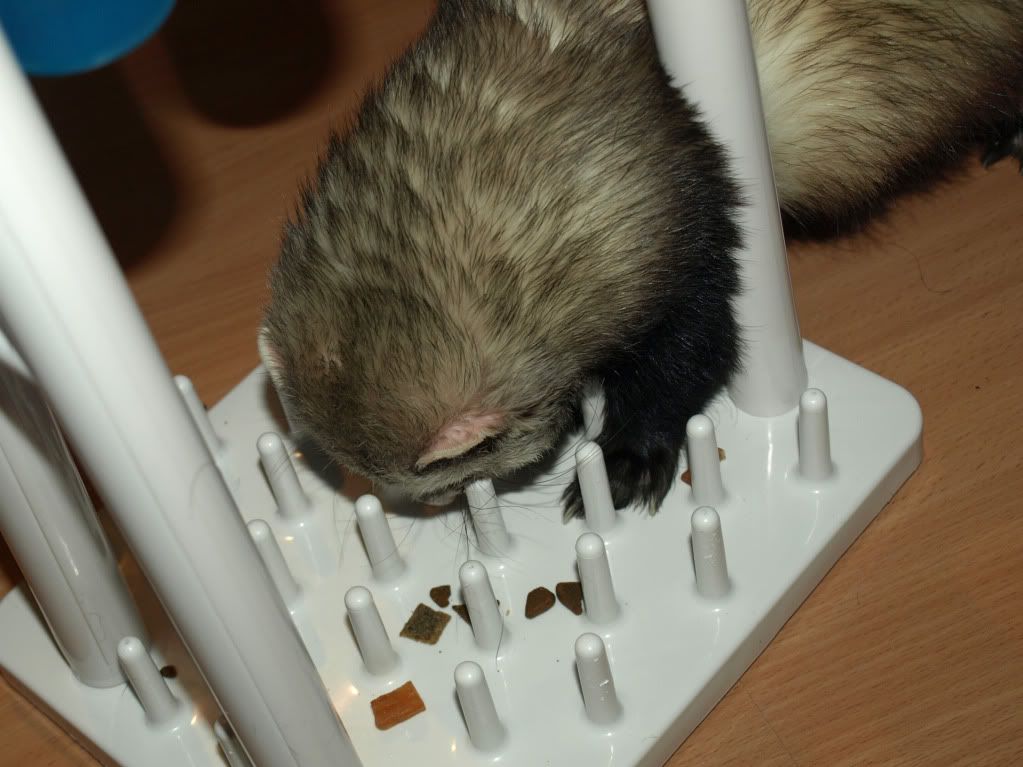 Jeg købte sådan en aktivitetsdims på zooplus, hvor de først skal vippe maden ud af rørene (nemt nok) og derefter få den ud fra "piggene" (knap så nemt). Lugh fangede også den med rørene med det samme, men blev ret frustreret da han så ikke kunne nå godbiderne med munden. Jeg må indrømme at jeg var tæt på at tage "pig"delen af, fordi jeg synes det var så synd og regnede med an aldrig ville fange den, men heldigvis lod jeg ham prøve selv. Nu har han fanget at han skal bruge poterne til at få maden ud. Han kan stadig godt blive lidt sur på den og slæbe den rundt, hvis det ikke lige virker, men han bliver mere og mere effektiv. Jeg har tydeligvis undervurderet hans intelligens.