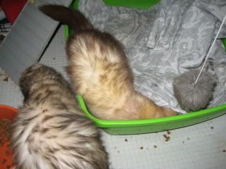igår da jeg stod og vaskede op lukkede jeg køkkenet af og lod ham rende rundt på gulvet i mens hvilket han virkeligt nød, jeg havde fundet et par drillepinde til katte frem som jeg lege lidt med ham med, han var i starten meget usikker på dem, men tilsidst var fristelsen for stor til at holde sig på afstand af dem og så kom han hoppende efter dem  :dans: efter jeg havde stået et stykkede tid og vasket op mens han fik lov til at rende rundt hoppede der lige pludseligt en lille fritte rundt om mine fødder, fik endda lov til at nusse ham lidt på ryggen uden han blev bange eller forsøgte at bide  :lol: prøv lige og spørg om jeg var en lykkelig lille mig  :D jeg er efterhånden helt sikker på vi nok skal få en god lille tot ud af ham.. min dejlige lille Fenrish